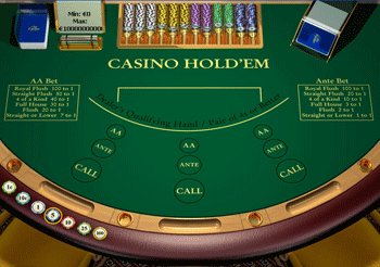 Casino Hold‘Em is a variation of five-card poker. You are dealt two cards, and you must use them along with the five-card flop to make the best possible poker hand. The AA side bet is optional. Here, you bet on whether the first five cards dealt (your two cards plus the first three flop cards) will include a pair of Aces or better. The best possible hand is formed for you automatically.